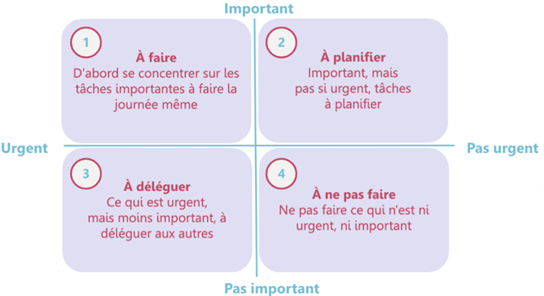 D’abord, la Matrice de Eisenhower (popularisée dans le livre de Covey, 1991) permet de classer les tâches en fonction de leur niveau d’importance et d’urgence.