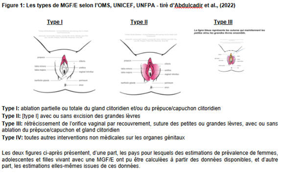 D’après l’Organisation mondiale de la santé (OMS), « les mutilations génitales féminines sont des interventions qui altèrent ou lèsent intentionnellement les organes génitaux externes de la femme pour des raisons non médicales » (OMS, UNICEF et UNFPA, 1997). Quatre types sont rapportés (Figure 1) :