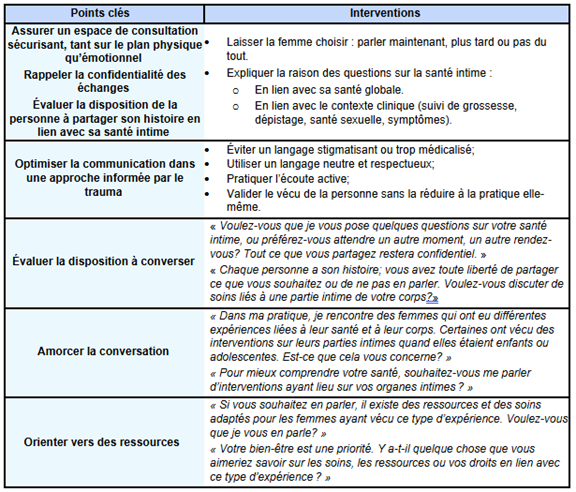 Les motifs de consultation - qu’il s’agisse d’un premier suivi de grossesse, de symptômes vulvaires ou génito-urinaires ou encore d’un dépistage du cancer du col de l’utérus constituent des moments clés pour instaurer une relation de confiance. Ces échanges offrent l’occasion de repérer d’éventuels facteurs déclencheurs liés à un vécu traumatique et de favoriser une approche clinique visant à limiter la réactivation du trauma (ministère de la Santé et des Services sociaux, Formation partagée continue, Environnement numérique d’apprentissage [ENA] : Intervenir en contexte d’immigration et de diversité ethnoculturelle).